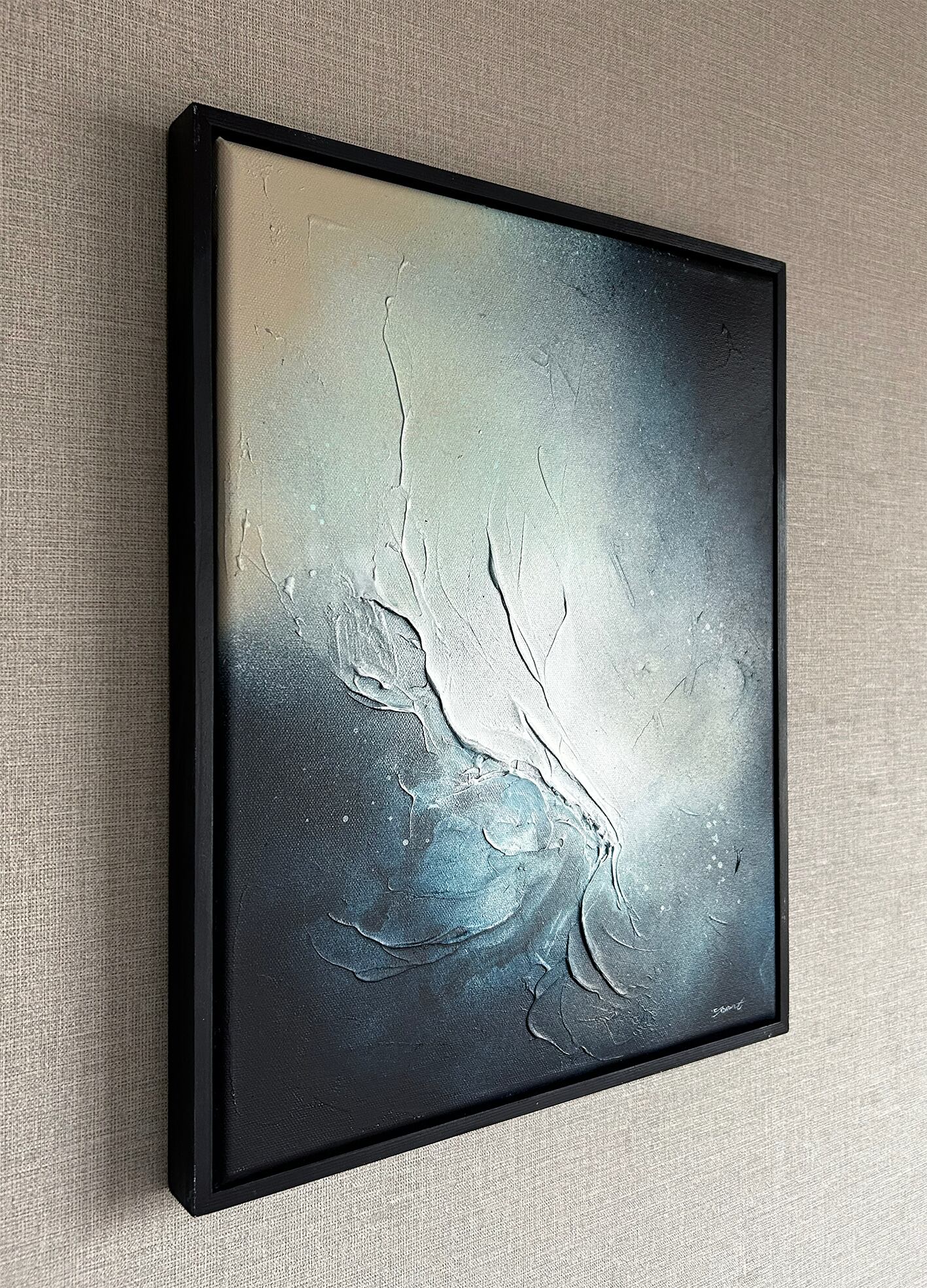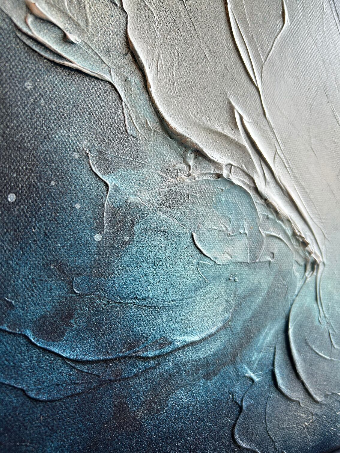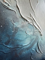 波のしぶきと夜の海をイメージした抽象画です。