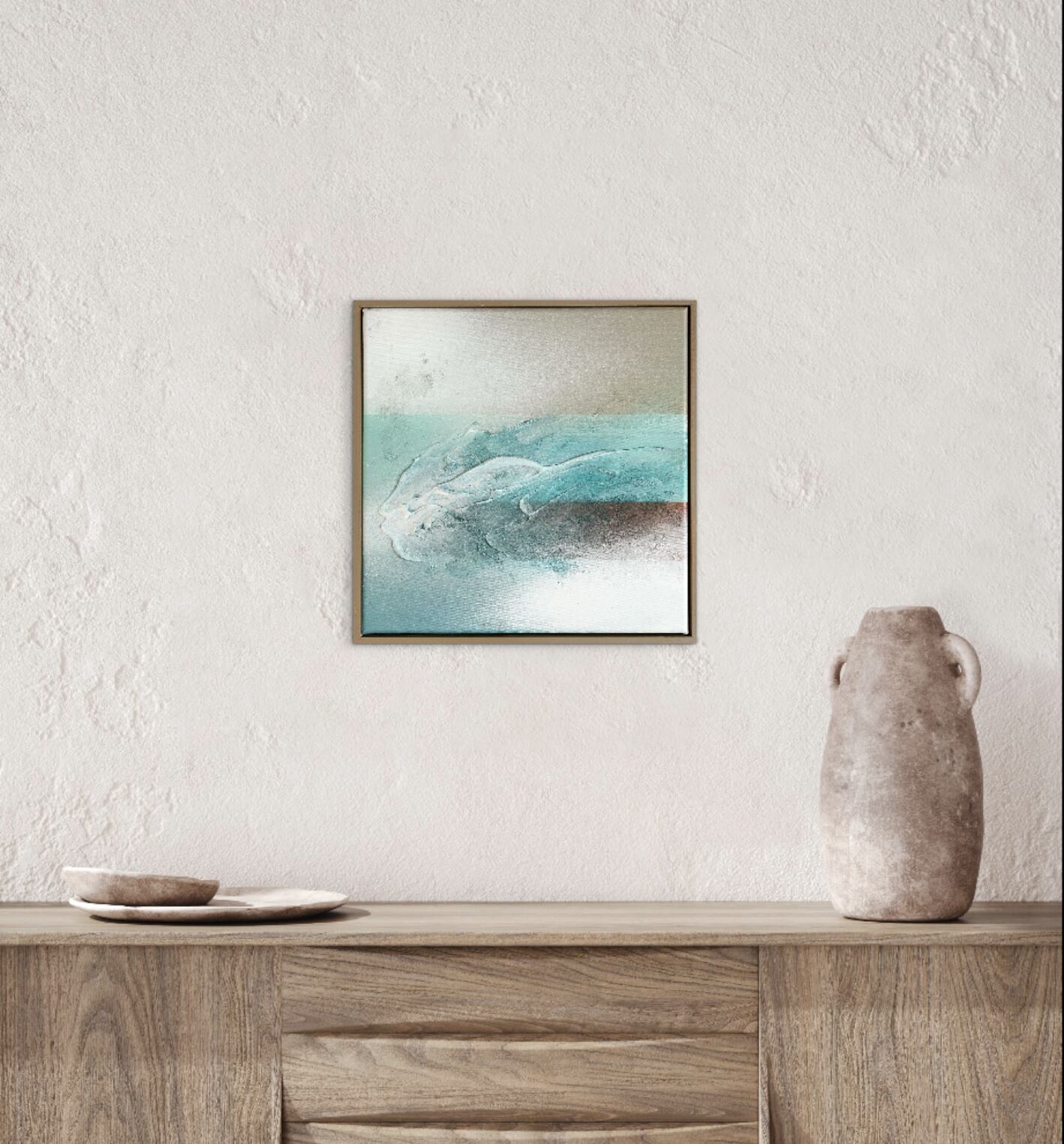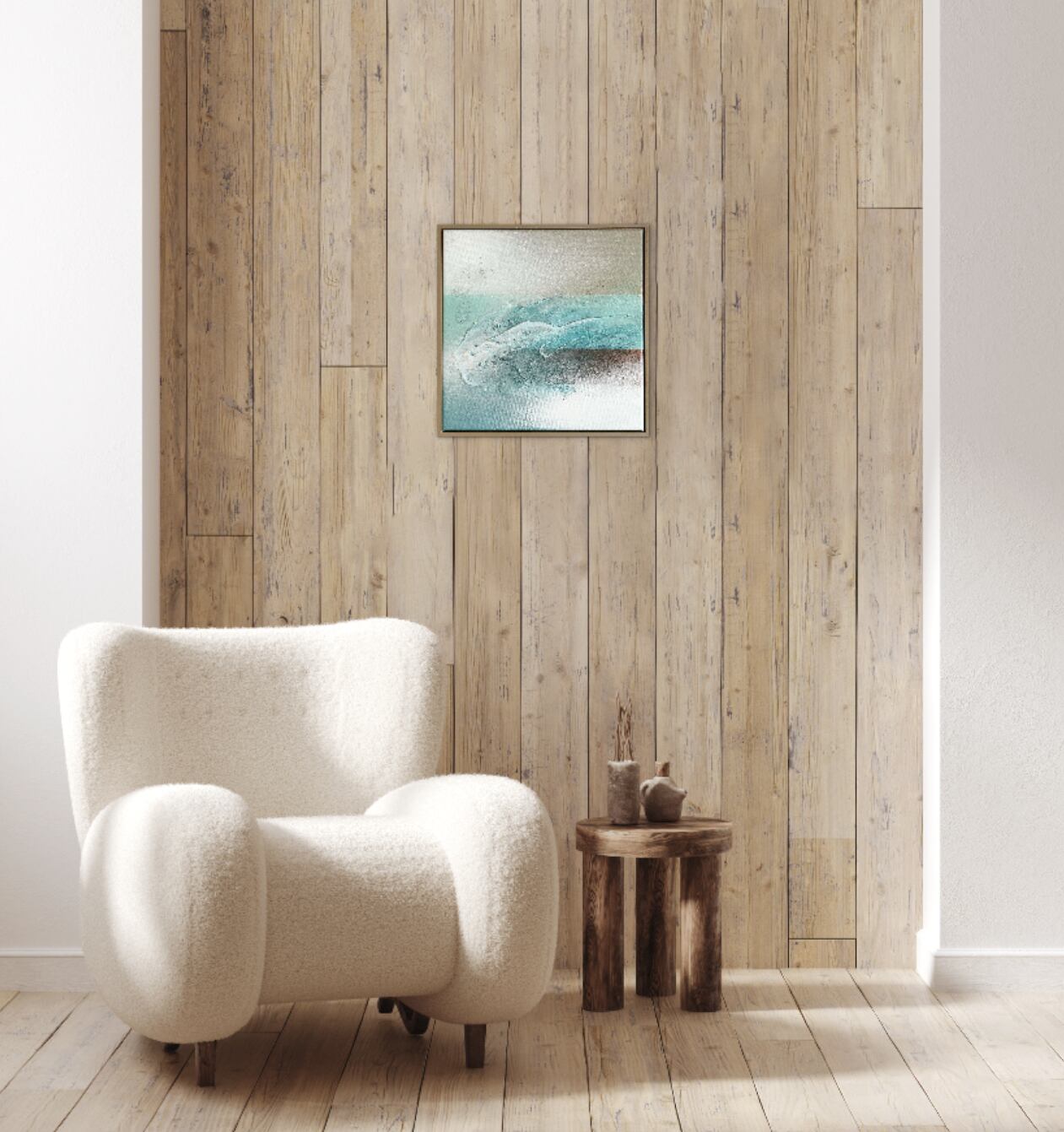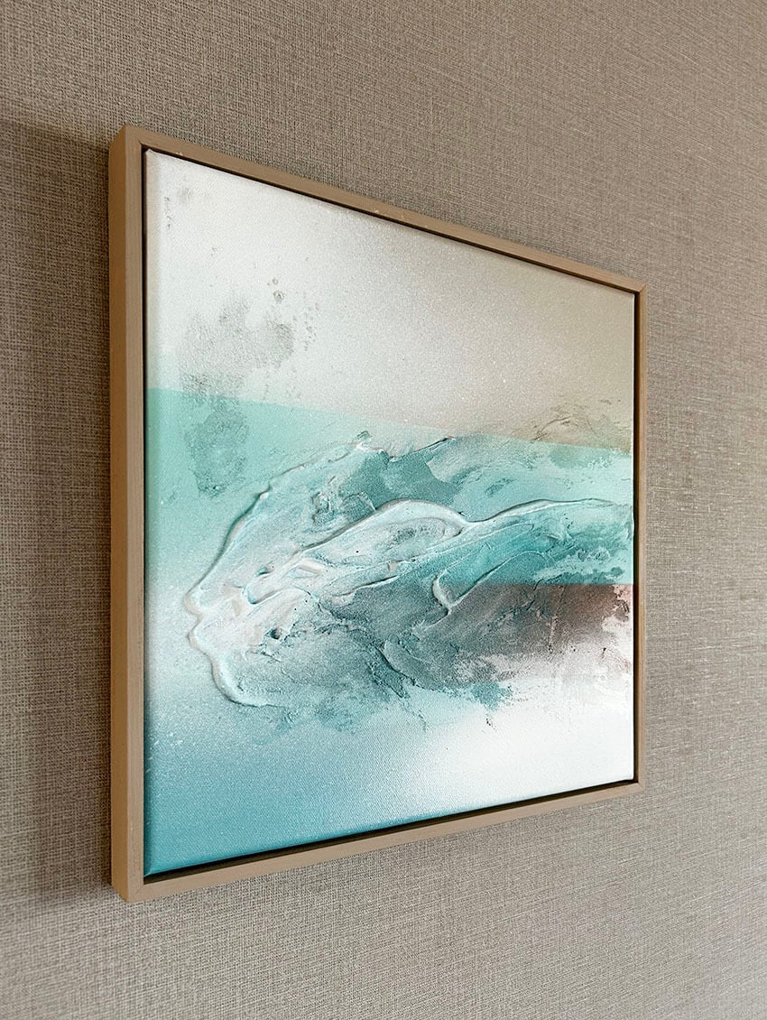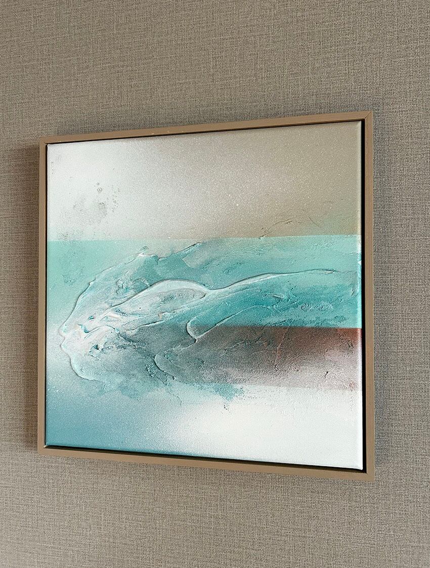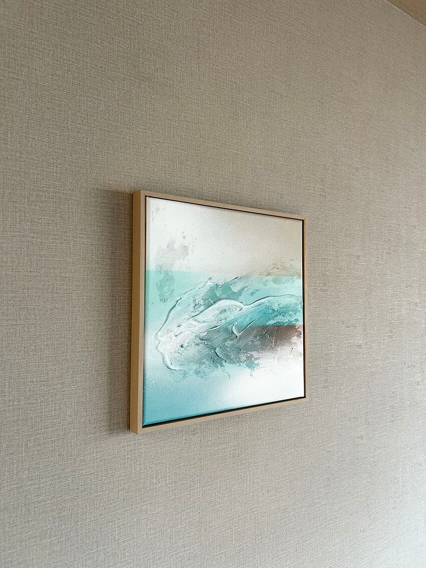 淡いターコイズとホワイトのレイヤーが重なり合い、水面のような透明感と穏やかな広がりを生み出しています。